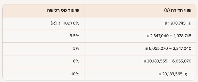 בעת רכישת דירה בישראל, חשוב להבין את שיעורי מס הרכישה החלים על העסקה. מס רכישה הוא מס חובה המשולם לרשות המסים, והוא מחושב לפי שווי הנכס וסוג הרוכש. בשנת 2025 חלו עדכונים במדרגות המס – הנה כל מה שצריך לדעת.