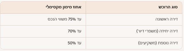 בהתאם להנחיות בנק ישראל, אחוז המימון המקסימלי נקבע לפי סוג הרוכש: